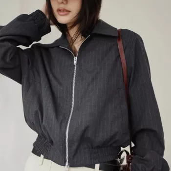 Striped Short Casual Jacket with Lapel and Double Zippers for Women