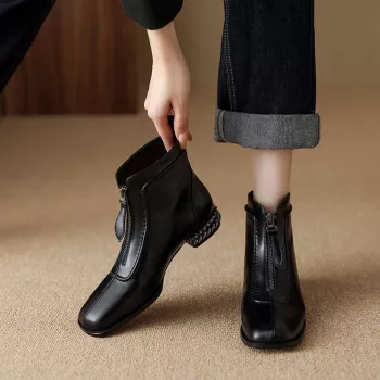 Genuine Leather Women’s Chunky Heel Pumps with Zip & Belt Buckle